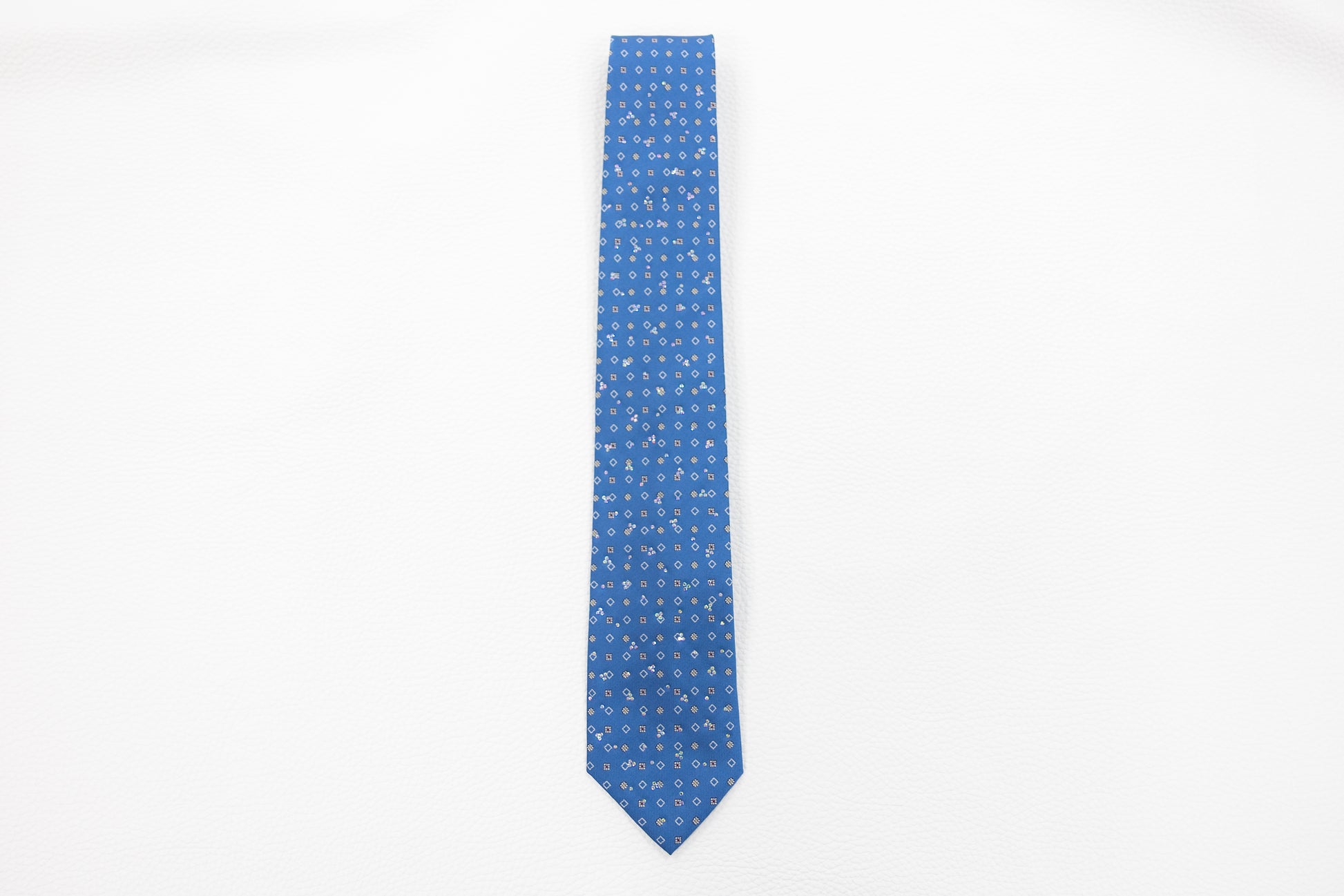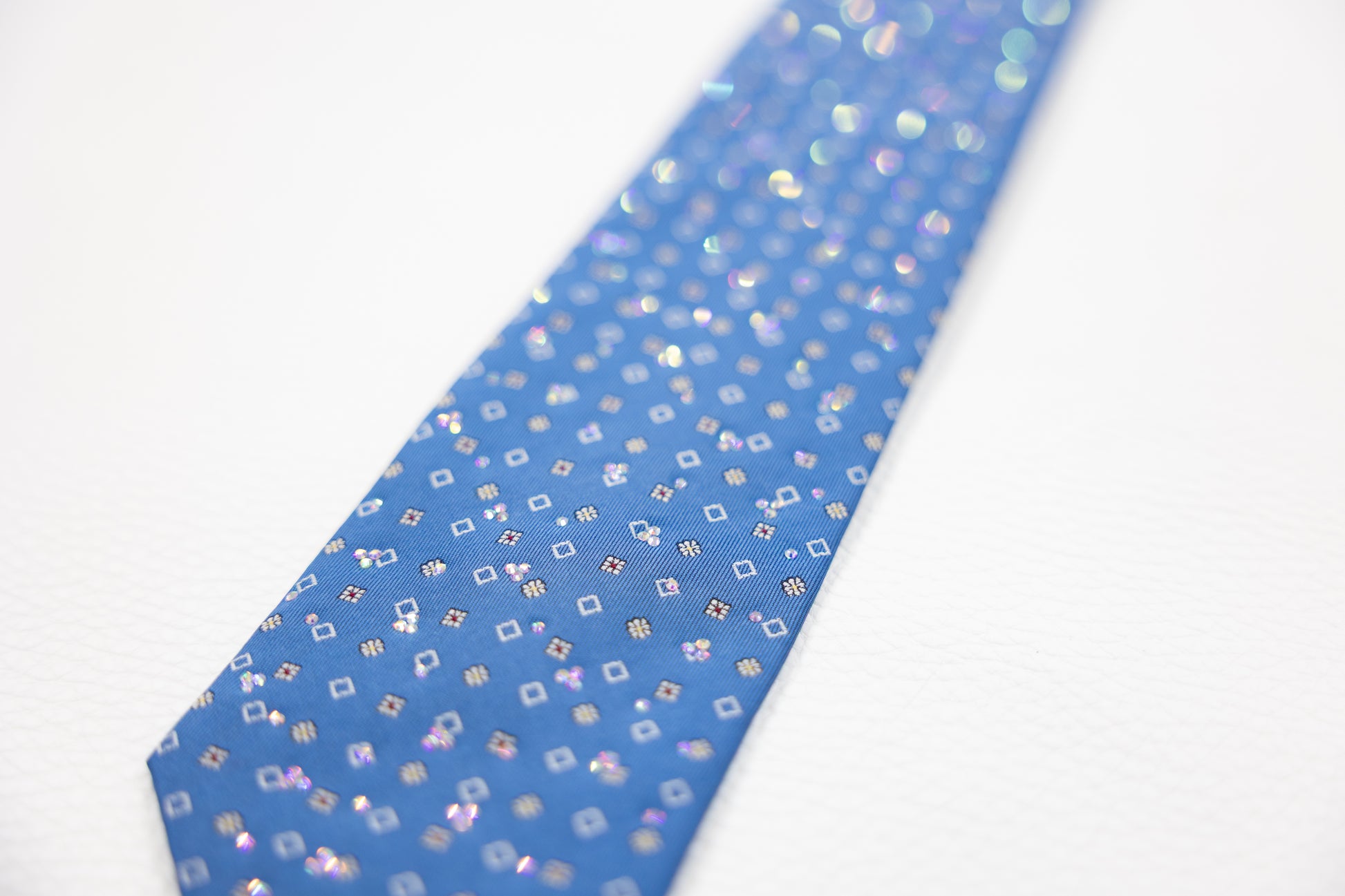 Add a touch of refined charm to your wardrobe with this elegant blue silk tie. Crafted with a smooth, premium weave, it features a delicate pattern of small diamond shapes and subtle floral accents, accented by a sprinkling of iridescent dots for a hint of sparkle. The soft yet vibrant blue pairs effortlessly with gray, navy, or charcoal suits, making it a versatile accessory for the office, weddings, or special events.