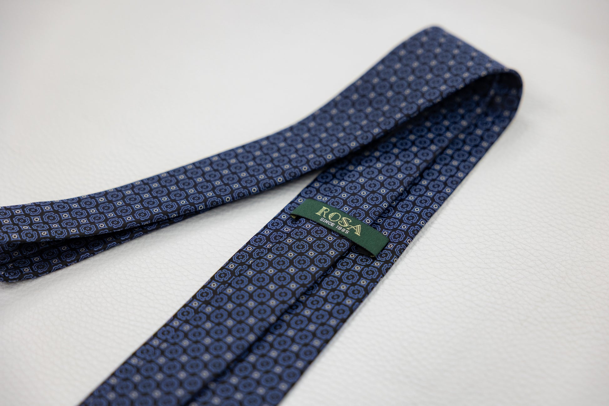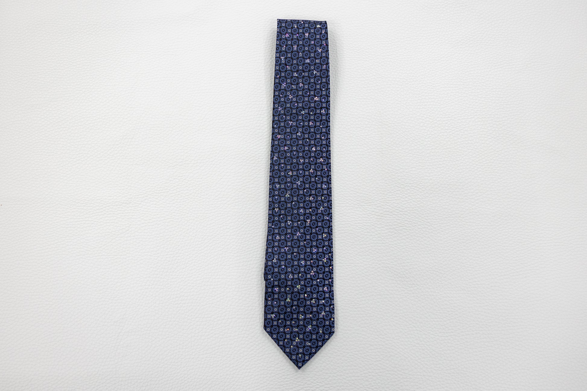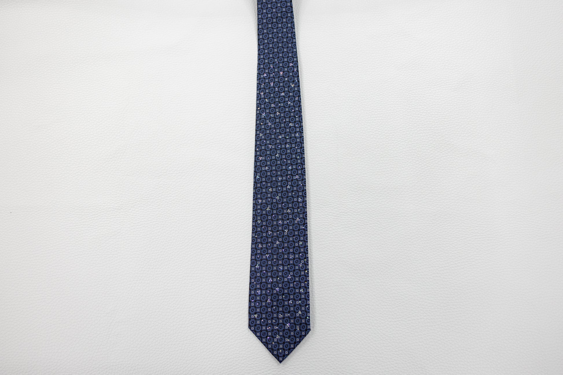 Upgrade your style with this navy blue tie featuring an elegant floral medallion pattern. The repeating geometric floral patterns adds sophistication and texture, while the deep navy background ensures versatility for both professional and formal settings. A refined choice for the modern gentleman who values classic design with a touch of flair.