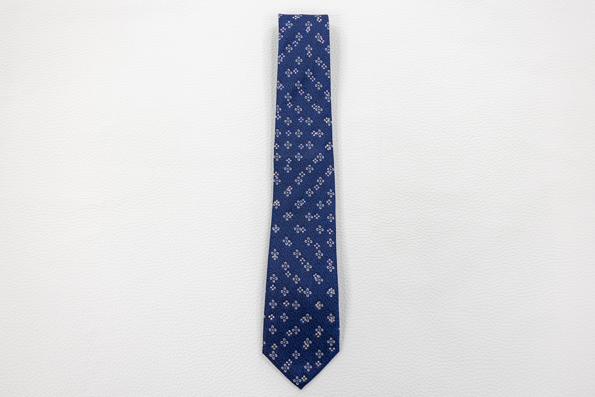 Navy Blue Silk Tie with Diagonal Floral Dot Patterns
