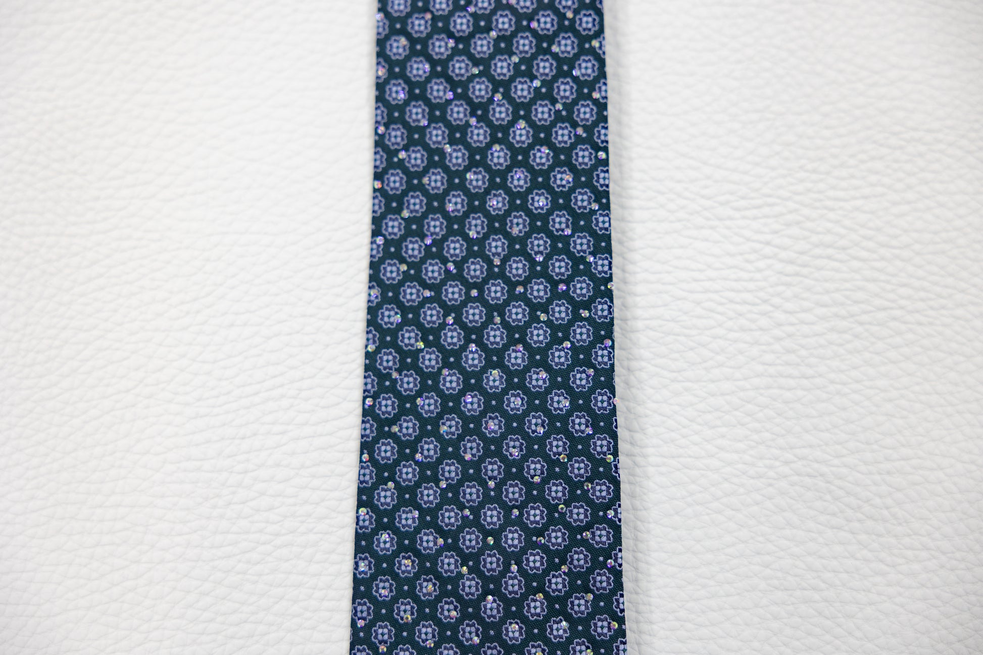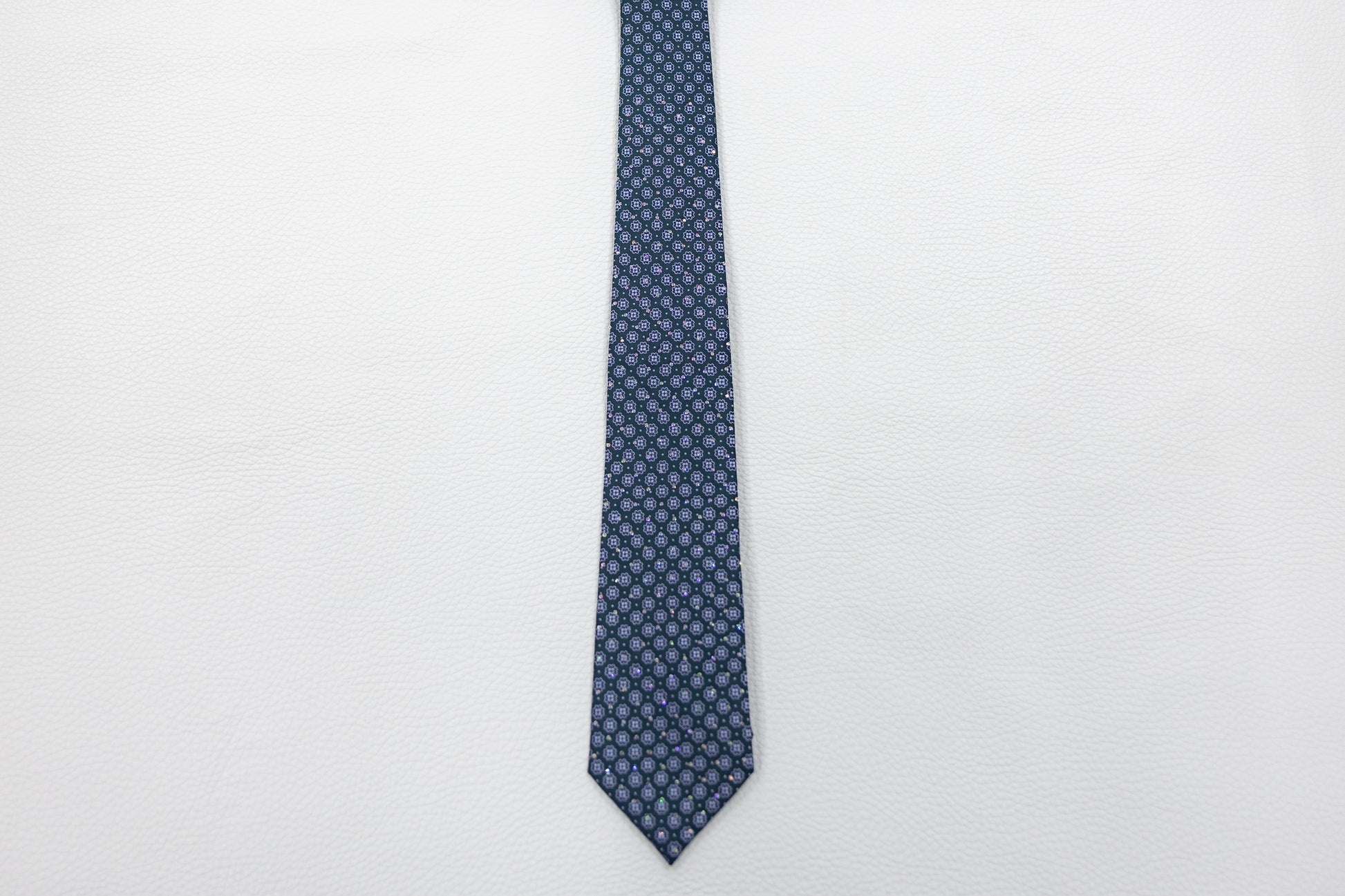 Bring classic refinement to your style with this navy blue silk tie, featuring an all-over geometric floral pattern in light blue and lavender tones. The design is subtle yet sophisticated, adding texture and charm without overpowering your look.