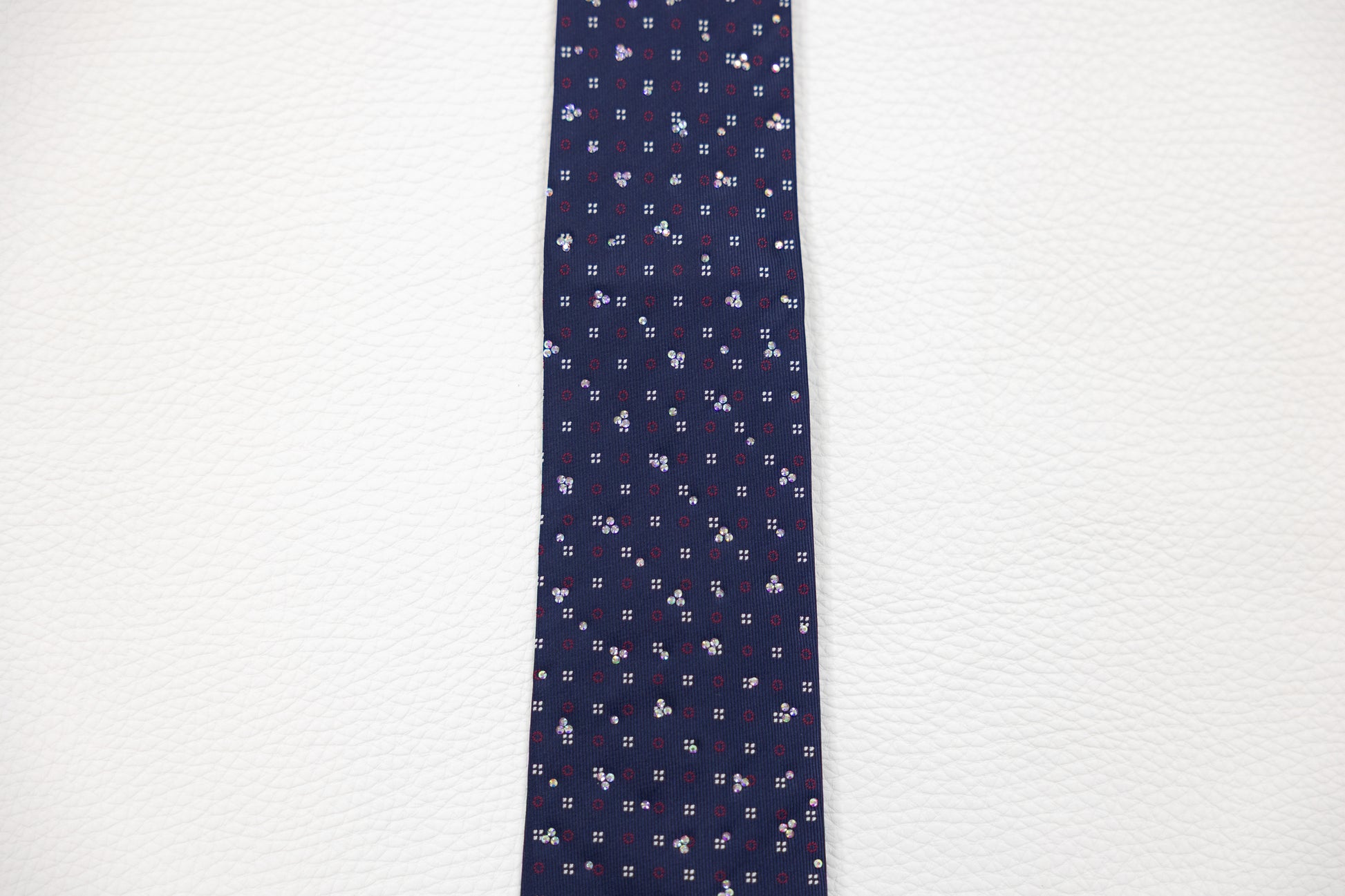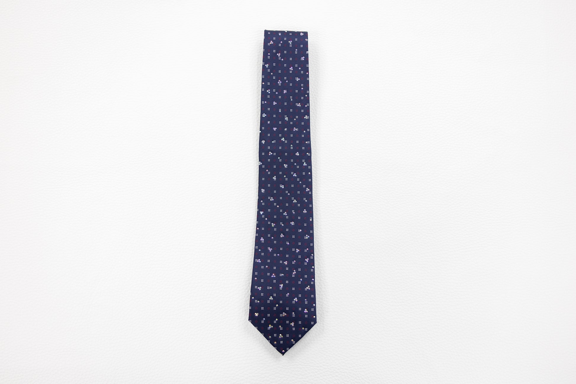 Navy Blue Silk Tie with Red & White Micro Floral Pattern