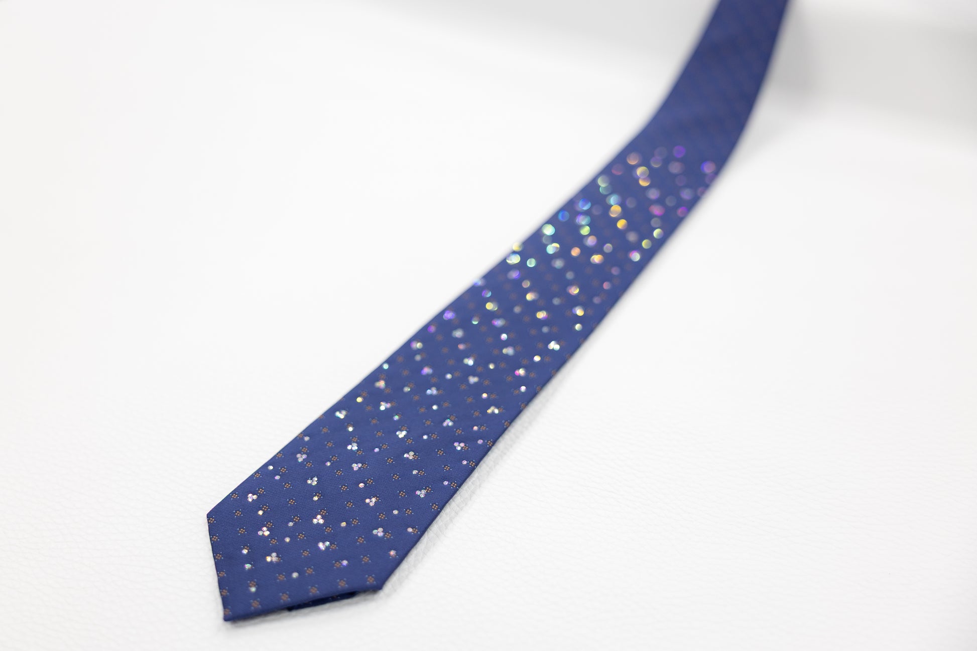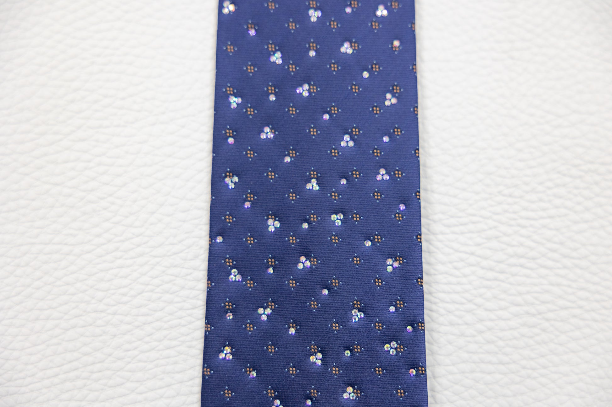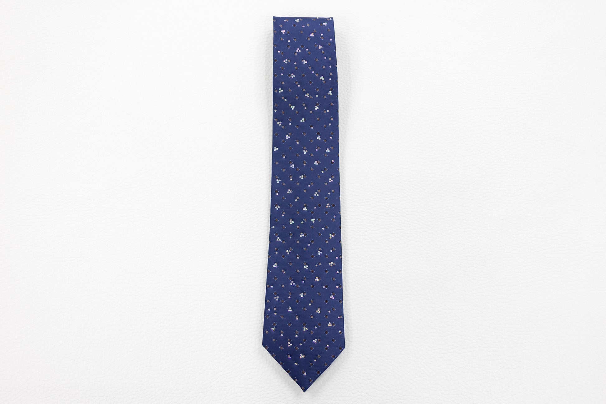 Elevate your look with this classic navy blue silk tie, designed for both business and special occasions. The tie features a refined pattern of small, shimmering floral-inspired rhinestones that add just the right amount of detail without being overpowering.