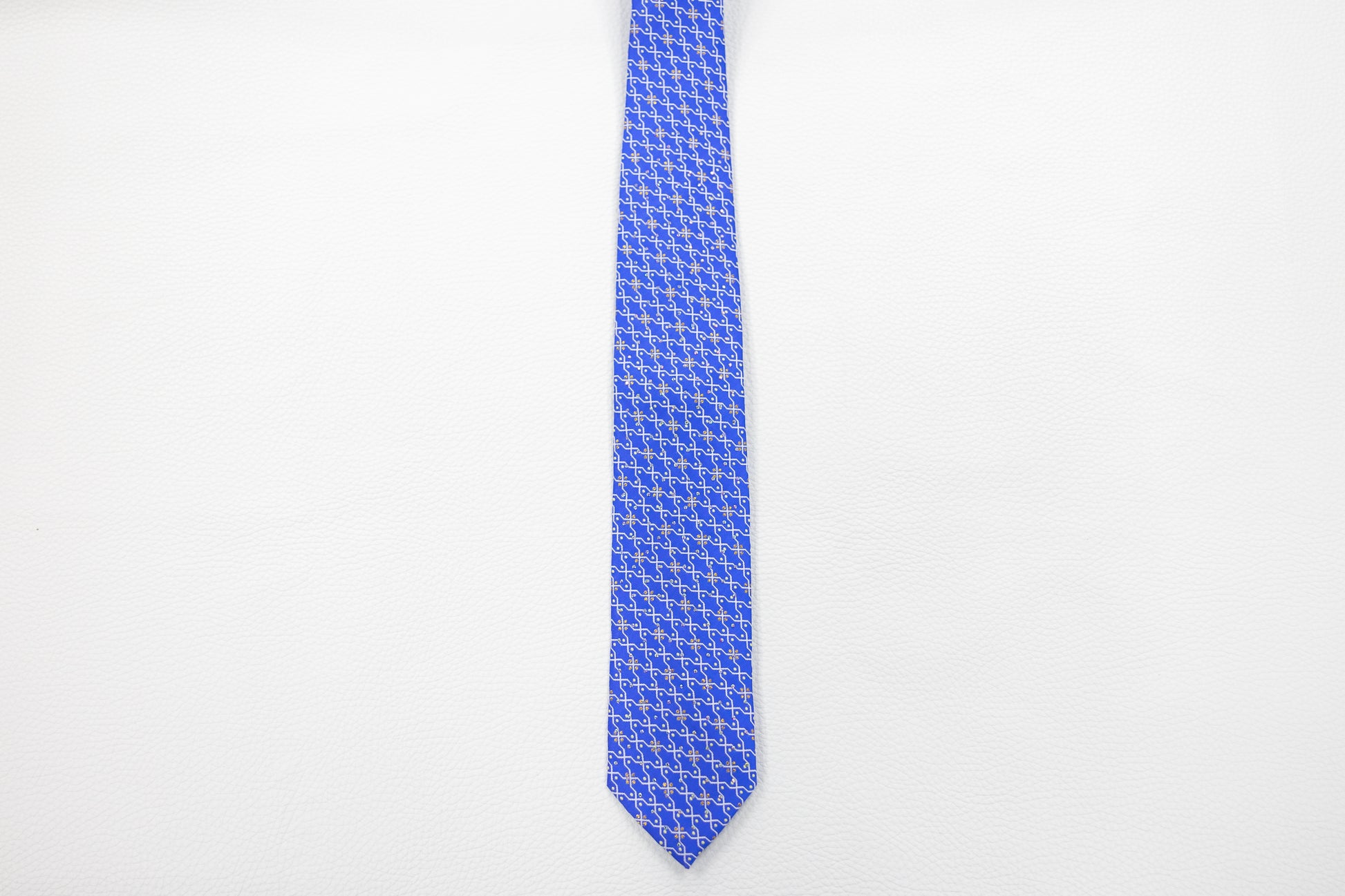 Make a bold statement with this royal blue tie featuring a unique geometric lattice design accented by delicate floral patterns. The vivid blue background is complemented by subtle gold and white details, creating a refined yet eye-catching piece that elevates any outfit.